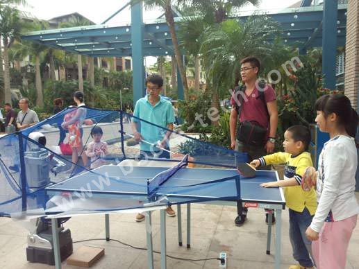 乒乓球機器人,一款能自動發(fā)球的機器人,通過遙控控制,可調整發(fā)球的速度以及方向。適合孩子們練習乒乓球,現(xiàn)場慕名而來的孩子和家長都紛紛圍住,希望能體驗一下機器人打乒乓球有多厲害!