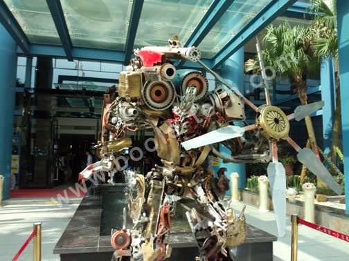 變形金剛“眩暈”,狂派角色,身高2米多,手部拿著一把直升機旋轉葉片,非常霸氣。為變形金剛配上距離感應裝置,當有人靠近變形金剛的時候,便會自動發(fā)出語音提醒,許多游客都紛紛停下腳步合影留念。